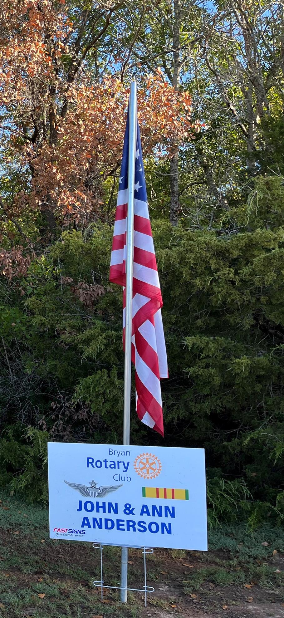 Every Veterans Week (since 2011) Bryan Rotary Club sets up our Field of Valor—1000 Flag Salute to Service. This is a patriotic display of American flags at Veterans Park in College Station, Texas. The Bryan Rotary Field of Valor project exists to SERVE the community through funds raised, to HONOR Active Military, Veterans, First Responders, and Healthcare workers for their selfless service through their vocation, and to EDUCATE students through teacher mini-grants and scholarships. For a $50 donation, a 3'x5' American Flag on a 10' pole will be posted and tagged with your name and your Honoree’s information. Click here to Reserve a Flag Tag.
